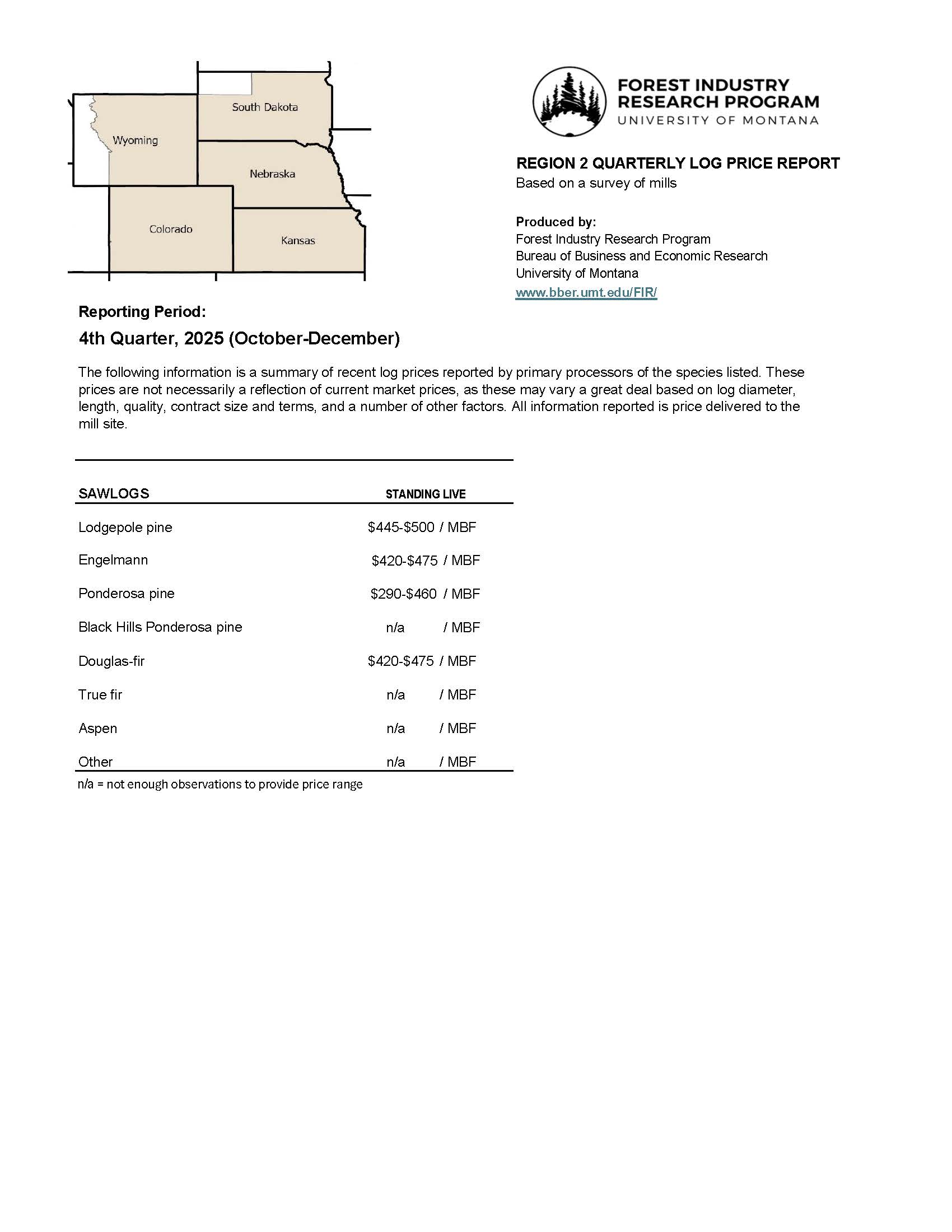 With the support of the USDA Forest Service Rocky Mountain Region (Region 2), the Bureau has developed a system to provide current mill-delivered prices for sawlogs and specialty products in the Rocky Mountain Region. These prices are based on quarterly surveys of timber-processing plants that receive logs or specialty timber products from all ownerships in the Region 2 geographic area. Mill-delivered prices are reported quarterly by timber product type and species.