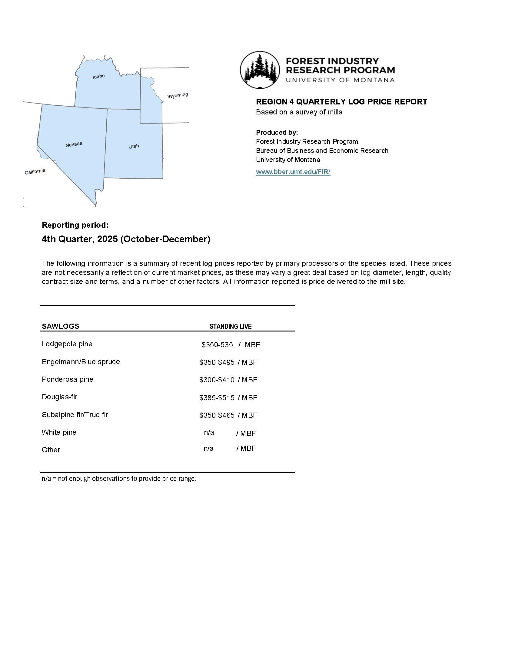 With the support of the USDA Forest Service Intermountain Region, the Bureau has developed a system to provide current mill-delivered prices for sawlogs and specialty products in the Intermountain Region (R4). These prices are based on quarterly surveys of timber-processing plants that receive logs or specialty products from ownerships in the R4 geographic area. Mill-delivered prices are reported quarterly by product type and species.