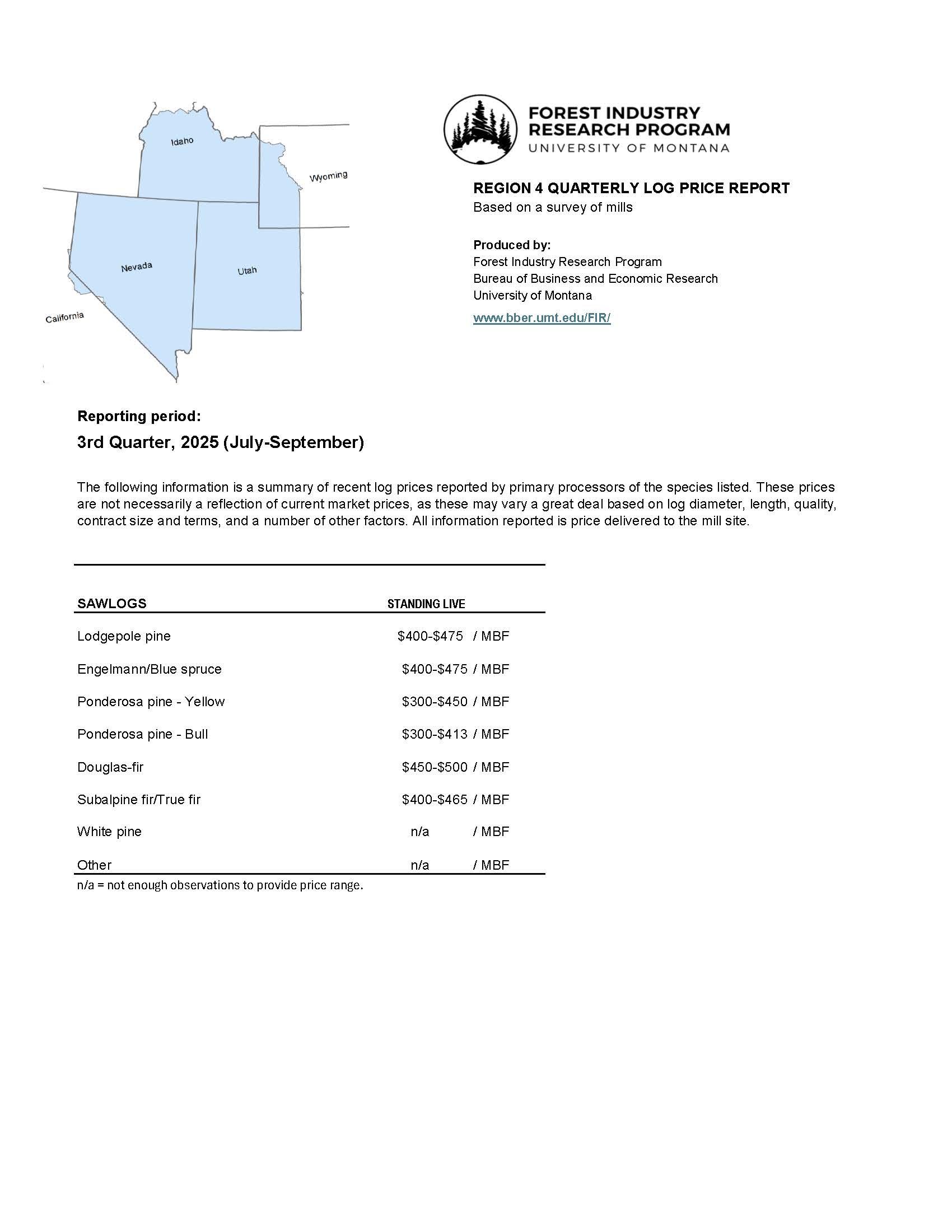 With the support of the USDA Forest Service Intermountain Region, the Bureau has developed a system to provide current mill-delivered prices for sawlogs and specialty products in the Intermountain Region (R4). These prices are based on quarterly surveys of timber-processing plants that receive logs or specialty products from ownerships in the R4 geographic area. Mill-delivered prices are reported quarterly by product type and species.